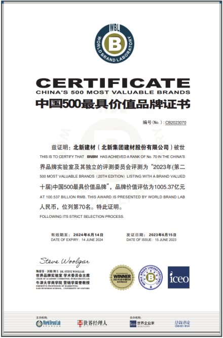 北新建材品牌价值再创新高,以全球行业龙头蓄力之势历史性突破1000亿元!品牌价值1005.37亿元,位列中国500最具价值品牌第70位。北新涂料以48.36亿元的品牌价值进入榜单。同时上榜的还有国家电网、中国工商银行、海尔、中国石油、中国人寿等企业。北新建材党委书记、董事长尹自波出席活动,并接受世界品牌实验室主席、牛津大学营销学教授斯蒂芬·沃格(Steve Woolgar)颁奖授牌,北新建材总工程师董占波参加活动。